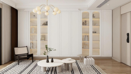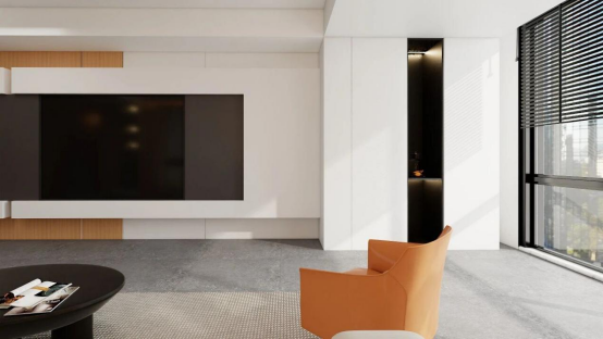 陽光穿過白紗漫進(jìn)空間,白色柜體與米脂白墻面暈出柔和的光影邊界;滿墻收納柜嵌入了帶燈光的黑色開放格,和白、米色調(diào)形成層次,連沙發(fā)旁的落地?zé)艟€條,都像風(fēng)掠過空間留下的輕痕。暖橙色單椅與淺灰抱枕,又給這份柔和添了點鮮活的溫度。