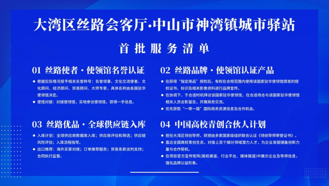大灣區(qū)絲路會(huì)客廳·中山市神灣鎮(zhèn)城市驛站作為賦能企業(yè)發(fā)展的新載體,將依托大灣區(qū)的區(qū)位優(yōu)勢(shì)與“一帶一路”發(fā)展機(jī)遇,打造集信息交流、資源對(duì)接、商務(wù)服務(wù)、文化展示于一體的綜合性平臺(tái),為企業(yè)出海發(fā)展、跨區(qū)域合作提供全方位支撐?,F(xiàn)場(chǎng)還發(fā)布了城市驛站首批服務(wù)清單,涵蓋絲路使者?使領(lǐng)館名譽(yù)認(rèn)證、絲路品牌?使領(lǐng)館認(rèn)證產(chǎn)品、絲路優(yōu)品?全球供應(yīng)鏈入庫(kù)、中國(guó)高校青創(chuàng)合伙人計(jì)劃等多個(gè)領(lǐng)域,精準(zhǔn)匹配企業(yè)發(fā)展需求,助力企業(yè)更好地融入“一帶一路”發(fā)展大局,凝聚起跨區(qū)域發(fā)展的強(qiáng)大合力。